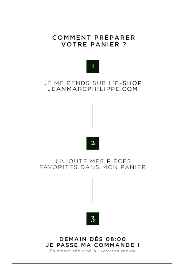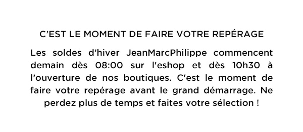 | Les soldes approchent ! C'est déjà demain le grand départ. Découvrez vos pièces favorites pour l'hiver, composez votre panier et profitez des réductions dès ce mercredi 10 janvier à 8:00. Sublimez votre style avec les trésors de notre collection en Noir et Blanc. Une sophistication intemporelle pour une élégance sans faille. Explorez sur jeanmarcphilippe.com et en magasin. |
